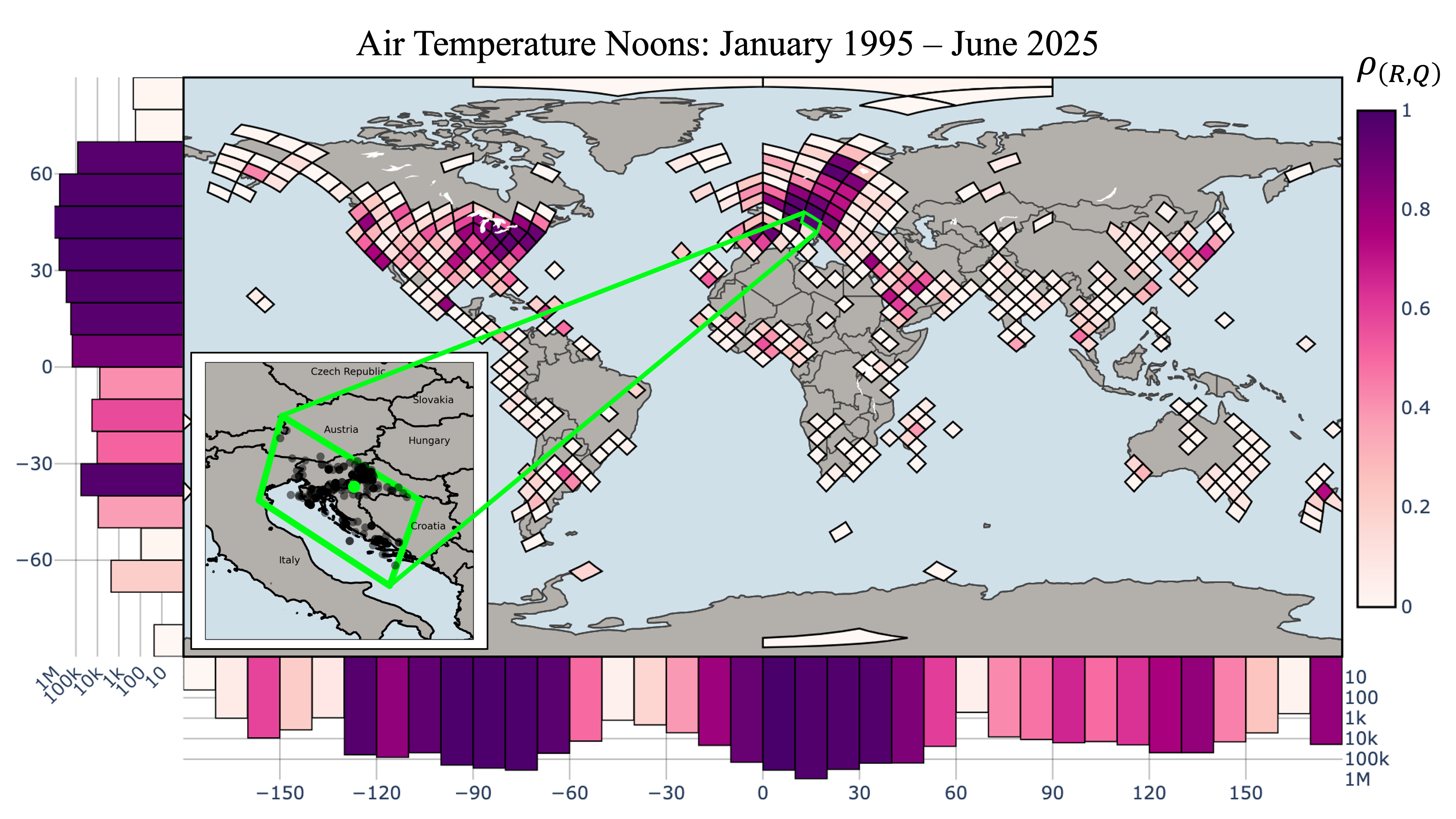 Data originating from equal-area map cells and 10-degree latitude and longitude bands have been scored using a custom metric for data regularity and quantity: