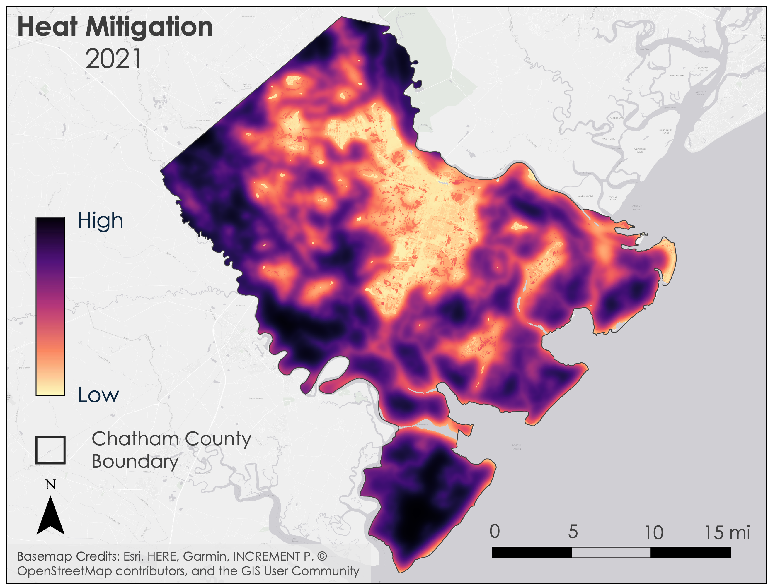 The heat mitigation capacity of Chatham County, Georgia. Heat mitigation index calculated using InVEST Urban Cooling Model.