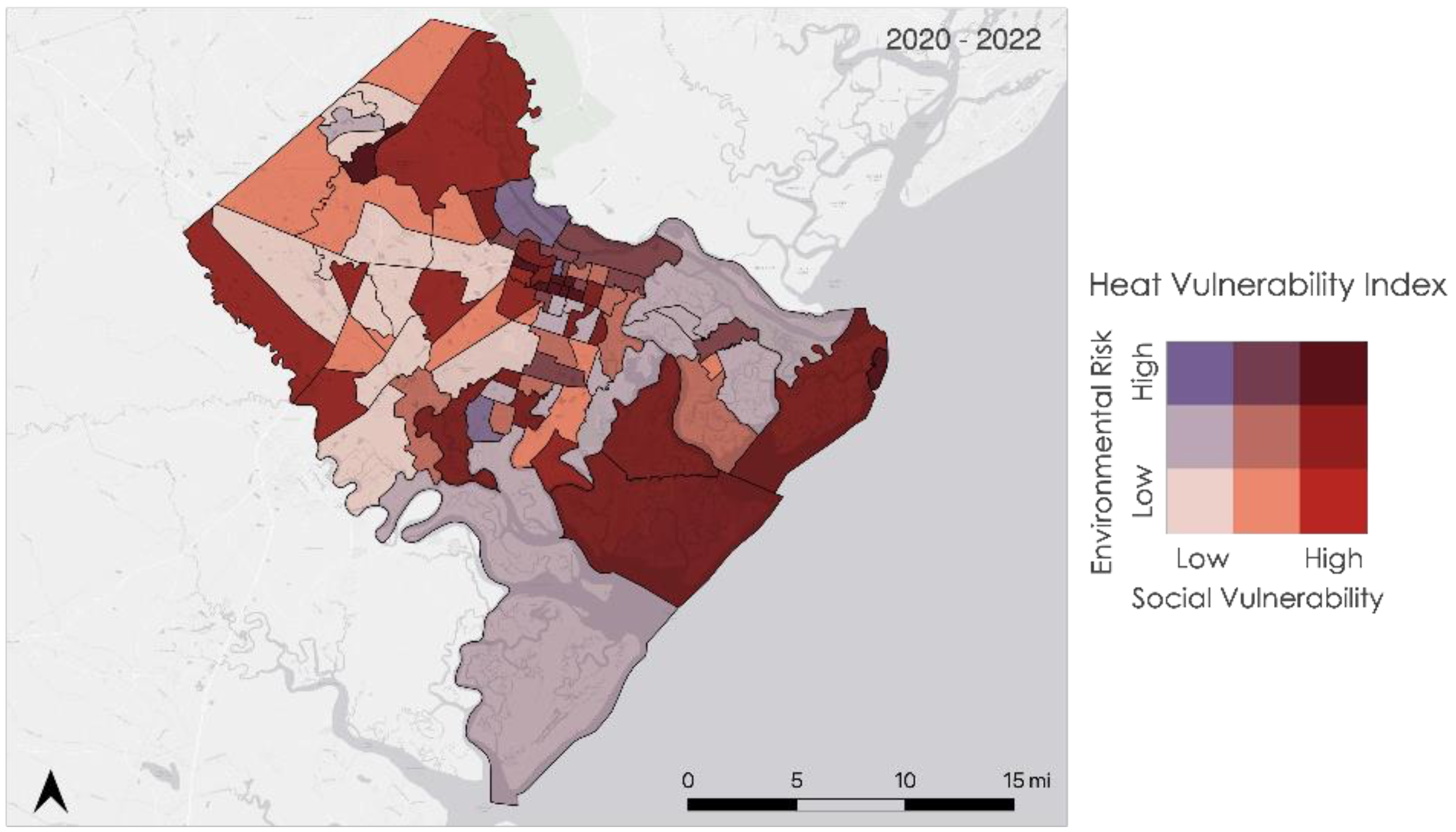 The Heat Vulnerability Index (HVI), displayed on a bivariate census tract map below, reveals the center of Savannah, as well as northern Pooler and Tybee Island, to show the greatest vulnerability to heat events.