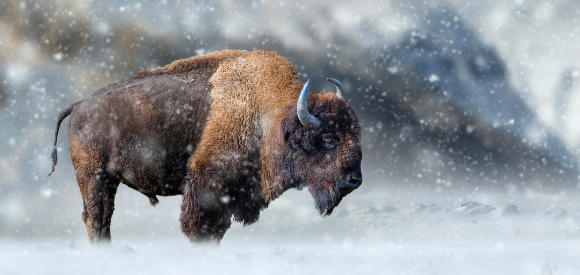 A bison in the snow (credit to byrdyak on AdobeStock).
